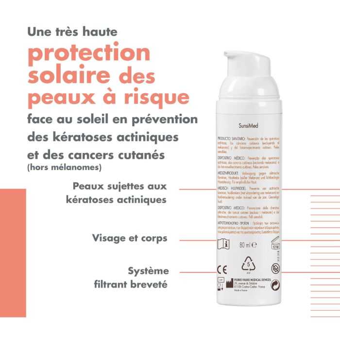 L’efficacité démontrée de SunsiMed Dispositif Médical lutte contre les effets délétères du soleil. Il s’utilise en prévention des kératoses actiniques, des cancers cutanés (hors mélanomes) et du photovieillissement cutané. Grâce à son complexe protecteur exclusif issu de la Recherche Pierre Fabre, SunsiMed, Dispositif Médical de classe I, protège la peau au quotidien face au rayonnement solaire. SunsiMed Dispositif Médical, une très haute protection solaire conçue comme une réponse complète adaptée aux peaux à risque face à l’exposition solaire.Conseils d’utilisation : appliquez, chaque matin, uniformément, sur le visage et les zones du corps exposées au soleil au cours de la journée. Pour les doses recommandées*, consultez attentivement la notice. Renouvelez l’application en cas d’exposition prolongée, de forte transpiration ou de contact avec l’eau. Évitez le contact direct avec le soleil en utilisant une protection vestimentaire (chapeau, lunettes, tee-shirt…).Ce dispositif est un produit de santé réglementé qui porte, au titre de cette réglementation, le marquage CE. Il ne s’applique pas sur les muqueuses ni sur une peau lésée.Demander conseil à votre pharmacien.Lire attentivement les instructions figurant sur l’étiquetage avant utilisation.Fabricant : Pierre Fabre Medical DeviceMars 2017*Attention, le niveau de protection peut être diminué si vous utilisez une quantité moindre.Les bienfaits :• PHOTOPROTECTEUR : des filtres UVB-UVA photostables qui luttent contre les effets nocifs du rayonnement solaire. • PRÉVENTION des kératoses actiniques et des cancers cutanés (hors mélanomes).Conseils d’utilisation:Appliquez chaque matin sur le visage et les zones du corps exposées au soleil. Renouvelez l’application en cas d’exposition prolongée, de forte transpiration ou de contact avec l’eau.