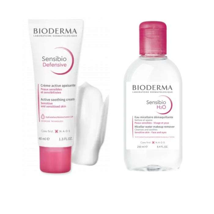 Le coffret contient : • BIODERMA SENSIBIO H2O EAU MICELLAIRE 250 ML: Sensibio H2O est une formule nettoyante ultra-douce, utilisez-la avec infiniment de douceur. Imbibez un coton de Créaline H2O et nettoyez et/ou démaquillez votre visage et vos yeux. Renouvelez l’application jusqu’à ce que le coton soit propreBIODERMA sensibio defensive 40 ml : Crème pour peaux sensibles Sensibio Defensive, Bioderma, Crème apaisante intensive conçue pour renforcer le pouvoir d’autodéfense des peaux sensibles et sensibilisées déclenchées par les agressions quotidiennes