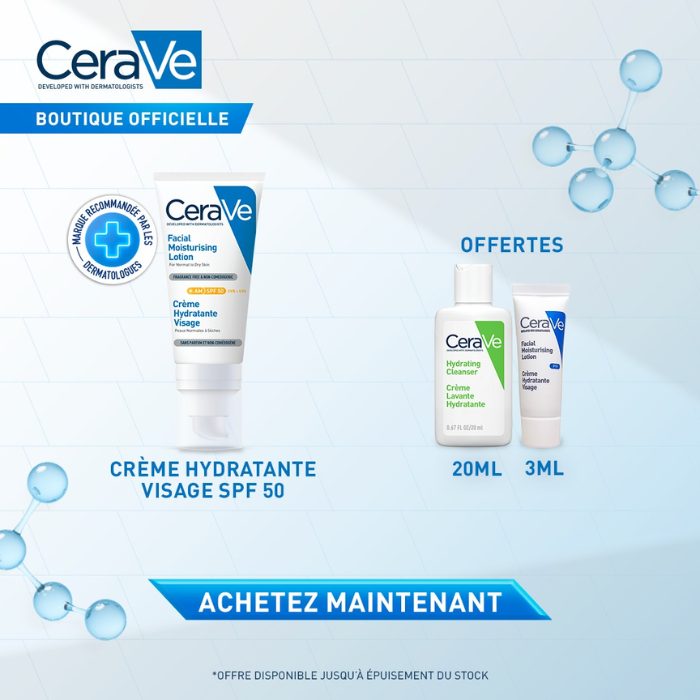 Développée en collaboration avec des dermatologues, sa formule associe des actifs dermatologiques reconnus pour leur efficacité et leur douceur. Enrichie en niacinamide et vitamine E, elle apaise instantanément la peau tout en renforçant sa barrière cutanée. Les 3 céramides essentiels (1, 3 et 6-II) contenus dans tous les produits CeraVe aident à restaurer la fonction barrière naturelle de la peau, tandis que l’acide hyaluronique assure une hydratation durable en captant l’eau dans les tissus.Sa technologie brevetée MVE diffuse progressivement les actifs tout au long de la journée, assurant une hydratation continue, sans effet gras ni brillance. Sans parfum, sans parabène et non comédogène, cette crème convient parfaitement aux peaux sensibles et sujettes aux imperfections.Que ce soit en ville ou à la plage, CeraVe Crème Hydratante Visage SPF 50 est le geste essentiel de votre routine quotidienne pour une peau souple, protégée et éclatante de santé.Conseils d’utilisationAppliquez généreusement chaque matin sur le visage et le cou parfaitement nettoyés.Renouvelez l’application en cas d’exposition prolongée au soleil.Évitez le contour des yeux.Complétez votre routine avec un nettoyant doux CeraVe pour de meilleurs résultats.Composition AQUA/WATER, GLYCERIN, CETEARYL ALCOHOL, PHENOXYETHANOL, STEARYL ALCOHOL, CETYL ALCOHOL, PEG-40 STEARATE, BEHENTRIMONIUM METHOSULFATE, GLYCERYL STEARATE, POLYSORBATE 20, ETHYLHEXYLGLYCERIN, POTASSIUM PHOSPHATE, DISODIUM EDTA, DIPOTASSIUM PHOSPHATE, SODIUM LAUROYL LACTYLATE, CERAMIDE NP, CERAMIDE AP, PHYTOSPHINGOSINE, CHOLESTEROL, SODIUM HYALURONATE, XANTHAN GUM, CARBOMER, TOCOPHEROL, CERAMIDE EOP