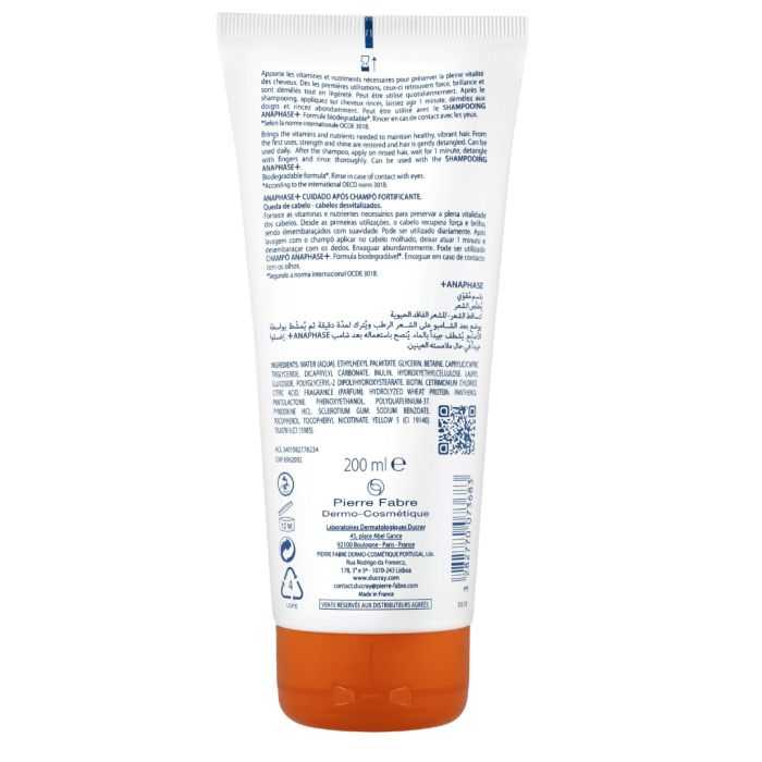 Le soin après-shampooing fortifiant ANAPHASE+ s’utilise en complément du shampooing complément antichute ANAPHASE + • Il est adapté aux problèmes de chutes de cheveux et cheveux dévitalisés • Il permet de faciliter le démêlage des cheveux tout en protégeant la coloration capillaireConseils d’utilisation:• Après le shampooing, appliquer sur cheveux rincés • Laisser agir 1 minute • Démêler aux doigts • Rincer abondamment