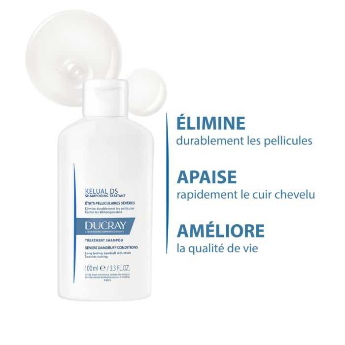 KELUAL DS Shampooing traitant apaise les démangeaisons et contribue à éliminer durablement les pellicules • Sa formule assainissante agit sur les facteurs responsables des états pelliculaires sévères et sur leur récidive, associés à d’intenses démangeaisons • Utilisé en phase d’attaque puis en phase d’entretien, il accompagne également les cuirs chevelus sujets à la dermite séborrhéique • KELUAL DS Shampooing traitant possède une association d’actifs brevetée*, à base de CICLOPIROXOLAMINE et de PIROCTONE OLAMINE, qui agit de façon synergique permettant d’éliminer rapidement et durablement les pelliculesConseils d’utilisation:• Phase d’attaque : 3 shampooings par semaine pendant 2 semaines • Phase d’entretien : 1 fois par semaine Son utilisation 1 fois par semaine en entretien permet de prévenir durablement la réapparition des pellicules • Appliquer et rincer • Renouveler l’application, laisser poser 3 minutes puis rincer