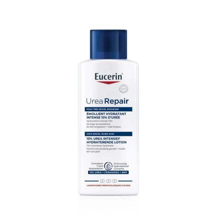 Détails ProduitEMOLLIENT CORPS REPARATEUR 10% D’UREE EUCERIN 250MLCe soin quotidien est utilisé pour les états de sécheresse cutanée sévère : peaux sèches constitutionnelles, peaux atopiques, prurigineuses, à tendance ichtyosique et xéroses, peaux desséchées par les traitements médicamenteux.Cette crème contient de l’Urée qui est agent naturel d’hydro-fixation (naturellement présent dans la peau). Elle réhydrate efficacement et durablement les couches supérieures de l’épiderme dès les premières applications. Elle favorise l’exfoliation et apaise les sensations de démangeaisons. Propriétés : – Soin quotidien Hydratant Très Haute Tolérance. – Favorise l’exfoliation, l’élimination des squames et apaise.- Apporte à la peau souplesse et confort dont elle a besoin. Composants :Contient de l’Urée : agent naturel d’hydro fixation (naturellement présent dans la peau) Avantages :Sa formule très haute tolérance est sans paraben, sans lanoline, sans parfum, sans colorant et hypoallergénique.Réhydrate efficacement et durablement les couches supérieures de l’épiderme dès les premières applications. Conseils d’utilisation :Appliquer après votre douche le matin et/ou le soir sur le corps.