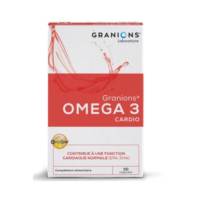 GRANIONS OMEGA 3 CARDIO bénéficie du label Qualitysilver, un gage de qualité et d’efficacité. Ce procédé de fabrication innovant assure une meilleure stabilisation de l’huile d’oméga 3, préservant ainsi ses précieux nutriments et garantissant une absence totale de remontées gastriques désagréables. Vous pouvez ainsi profiter pleinement des bienfaits de ces acides gras essentiels sans aucun inconfort. L’acide eicosapentaénoïque (EPA) et l’acide docosahexaénoïque (DHA), les stars de cette formule, sont reconnus pour leur rôle crucial dans le maintien d’une fonction cardiaque normale. Intégrer GRANIONS OMEGA 3 CARDIO à votre routine quotidienne est un geste simple et efficace pour soutenir votre santé cardiovasculaire et votre bien-être général.Ne laissez pas votre cœur au hasard, offrez-lui le soutien nutritionnel qu’il mérite avec GRANIONS OMEGA 3 CARDIO. Ces capsules de haute qualité, issues d’un processus de fabrication rigoureux, vous apportent les oméga 3 essentiels pour une fonction cardiaque normale et un équilibre alimentaire optimal. Faites confiance à l’expertise du Laboratoire des Granions pour prendre soin de votre cœur et de votre bien-être au quotidien.Conseils d’utilisation :Posologie : Prendre 1 capsule par jour.Moment de la prise : Il est recommandé de prendre les capsules au cours d’un repas, avec un grand verre d’eau, pour favoriser une meilleure absorption des oméga 3.Durée de la cure : La durée d’utilisation peut varier en fonction des besoins. Une cure de 30 jours (1 boîte) peut être renouvelée si nécessaire.Composition : Huile de poisson, antioxydants : mélange de tocophérol (E306), extrait de romarin (E392). Capsule : gélatine de poisson, humectant : glycérol végétal (E422)