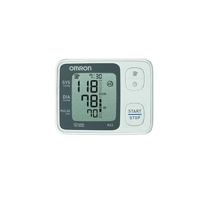 Omron RS3 Tensiomètre automatique au poignet Le tensiomètre électronique au poignet Omron RS3 extra fin est doté d’un guide d’enroulement correct du brassard et d’un signal sonore indiquant la fin de la prise de tension. Le tensiomètre Omron RS3 est un dispositif médical validé cliniquement. Caractéristiques du tensiomètre au poignet Omron RS3 : -Entièrement automatique -Dimensions du poignet : 135 à 215 mm -Affichage simultané de toutes les valeurs : Diastole, Systole, Pouls et heure -Détection de pulsations cardiaques irrégulières -Détecteur de mouvement -Indicateur d’hypertension -60 mémoires avec indication de la date et de l’heure de la prise de tension -Moyenne des 3 dernières mesures -Technologie Intellisense -Système de vérification du bon positionnement du brassard (affichage d’une icône spécifique) Le tensiomètre Omron RS3 est livré avec un jeu de piles et une boîte de rangement rigide