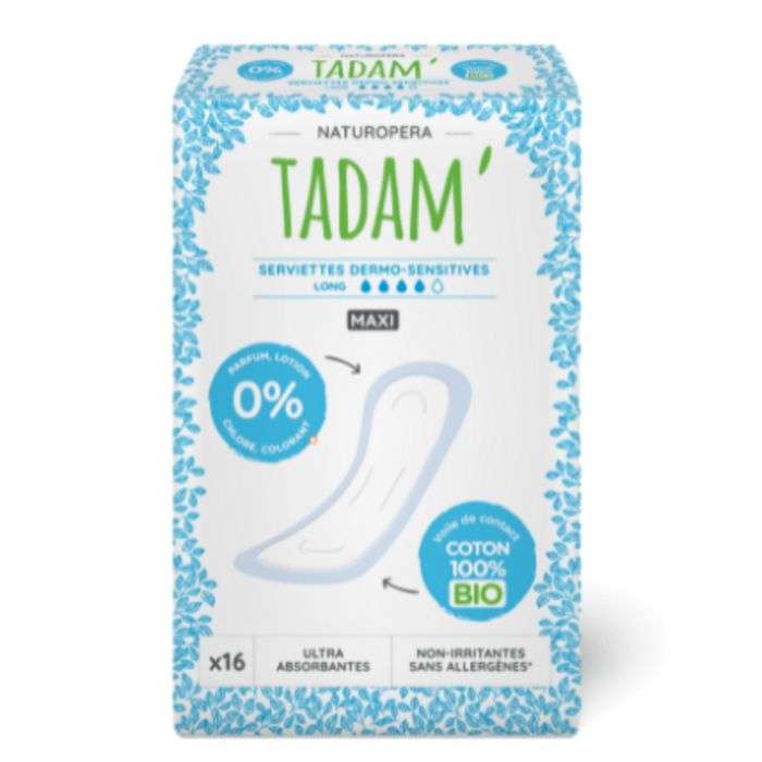Les serviettes Maxi Long dermo-sensitives vous offrent un confort optimale grace à leurs formes anatomiques.Restez sereine grace à leur qualité d’absorption qui convient tout particulièrement aux flux abondants. Les serviettes Tadam’ Maxi existe aussi en taille Normal.✓ Voile de contact en coton issu d’agriculture biologique✓ Coeur absorbant composé à 100% de cellulose naturelle✓ Sans allergène* et hypoallergénique (*Ne contiennent aucun des 26 allergènes listés par l’Union Européenne)✓ Garanti sans chlore, sans parfum, sans lotion et sans colorant