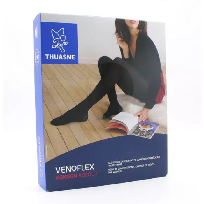 L’une des caractéristiques notables de ce bas-cuisse est sa bande antiglisse en silicone à effet vague, spécialement conçue pour maintenir le bas en place sans comprimer la peau. Cette technologie respirante garantit une tenue optimale du matin jusqu’au soir, évitant ainsi les désagréments liés au glissement ou au serrage excessif. De plus, les zones des orteils et de la plante du pied sont renforcées, assurant une durabilité accrue et une résistance aux frottements quotidiens.Au-delà de ses aspects fonctionnels, le Venoflex Kokoon Absolu se distingue par ses finitions féminines. Les motifs « gouttes », signature de la gamme Venoflex, ajoutent une touche esthétique raffinée, permettant aux utilisatrices de concilier santé et élégance. La culotte très extensible du collant est conçue pour s’adapter à différentes morphologies sans exercer de pression sur le ventre, offrant ainsi un confort supplémentaire.Conseils d’utilisation :Enfilage : Il est recommandé de mettre le bas-cuisse dès le matin, avant de se lever, lorsque les jambes sont les moins enflées. Retournez le bas jusqu’au talon, enfilez-le pied, puis déroulez progressivement le bas le long de la jambe en veillant à éliminer les plis.Entretien : Pour préserver l’élasticité et la durée de vie du produit, lavez-le quotidiennement à la main ou en machine à une température ne dépassant pas 30°C, de préférence avec un filet de lavage. Évitez l’utilisation d’adoucissants et le séchage en machine.Précautions : Ce produit est contre-indiqué en cas d’artérite des membres inférieurs aux stades avancés ou de microangiopathie diabétique évoluée. En cas de doute, consultez un professionnel de santé avant utilisation.En adoptant le bas-cuisse Venoflex Kokoon Absolu, vous choisissez une solution alliant efficacité médicale, confort quotidien et esthétique soignée, pour des jambes légères et élégantes tout au long de la journée.